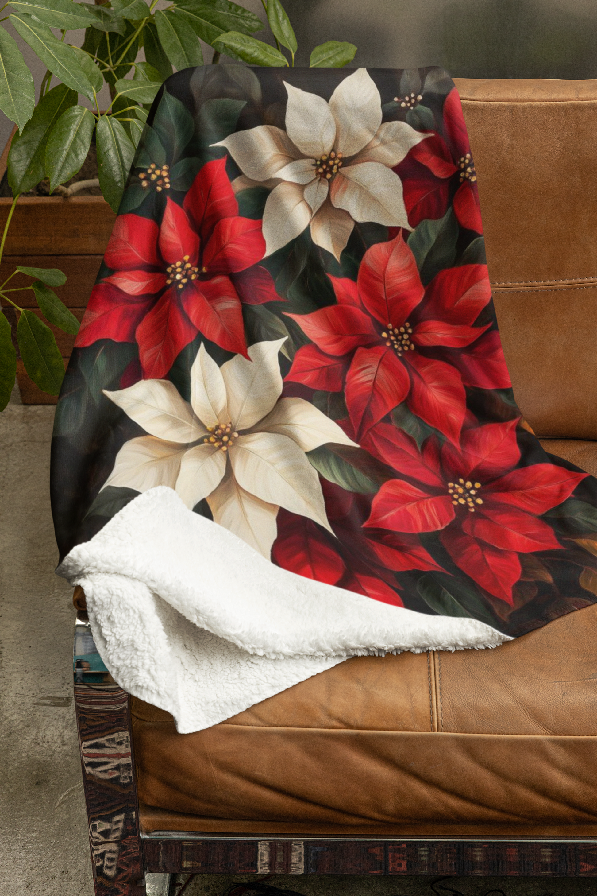 A luxurious Plush Velveteen Blanket featuring beautiful rich colored poinsettias on a black background, giving off a festive and cozy vibe. Perfect for snuggling up during the holidays or adding a touch of seasonal cheer to a home decor. Ideal for adults looking for a high-quality and stylish blanket.