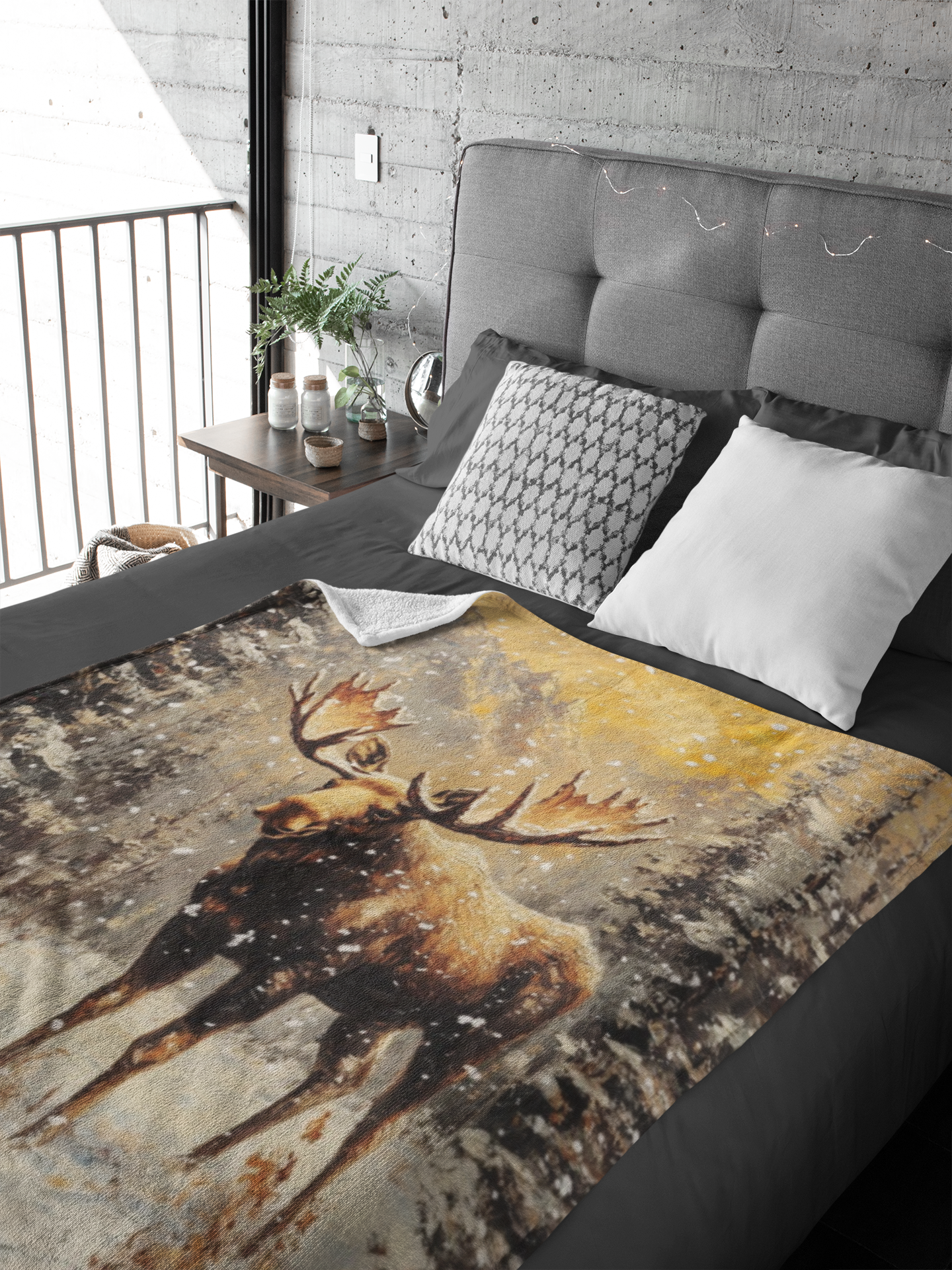 Wrap yourself in the majesty of winter with this stunning velveteen plush blanket, featuring a breathtaking scene of a magnificent bull moose standing serene in a snow-laden forest. The artwork captures golden light filtering through towering pines, illuminating the noble creature against snow-covered peaks—a moment of pure wilderness tranquility. Crafted from luxuriously soft velveteen material, this blanket delivers exceptional warmth and comfort for chilly evenings. Perfect for creating a cozy retreat or gifting to nature enthusiasts, it transforms any space into a peaceful alpine sanctuary while providing the plush softness you crave.